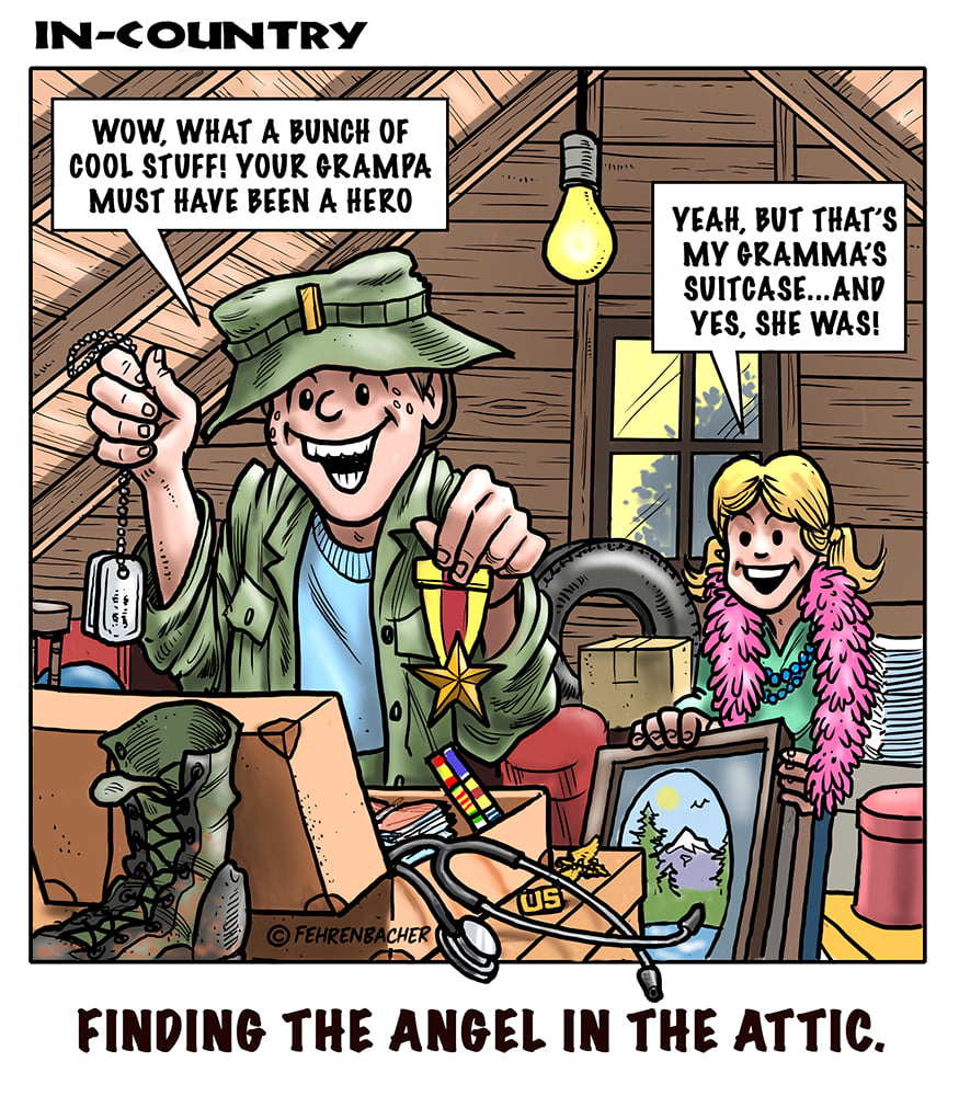 Phil enlisted in the Army in 1965 where he served for years in Vietnam. He became a graphic designer and has worked for the state of Oregon for 26 years. He retired in 2003 and started the Cartoon "In-Country". The cartoons reflect his experiences during his tour of duty in South Vietnam.